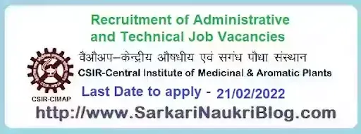 CSIR-Central Institute of Medicinal and Aromatic Plants (CSIR-CIMAP), invites online applications in the prescribed format from Indian citizens for the recruitment of various Group-A, Group-B and Group-C Administrative & Technical Government Job vacancy posts from enthusiastic young and dynamic Indian Nationals in CSIR CIMAP. (Employment Advertisement No.1/2021) SarkariNaukriBlog